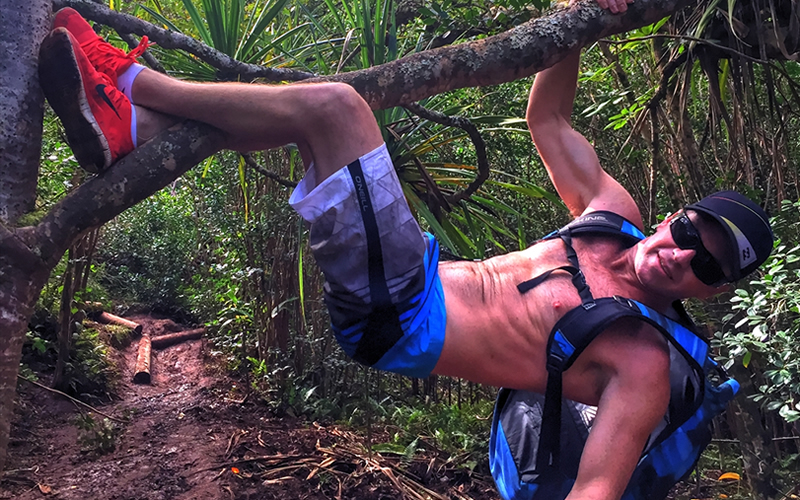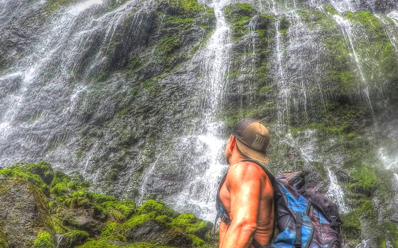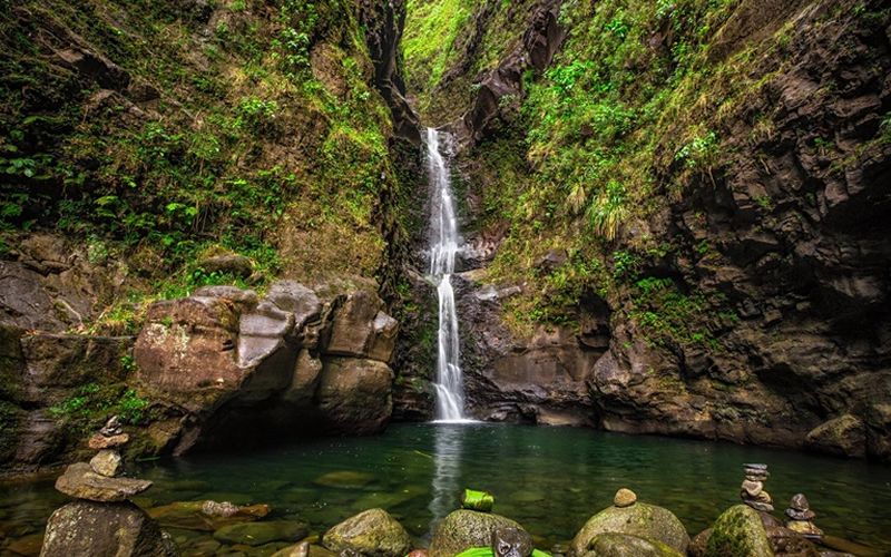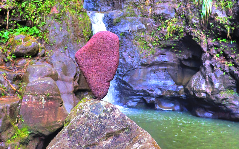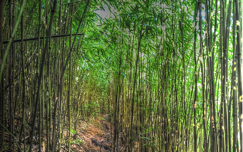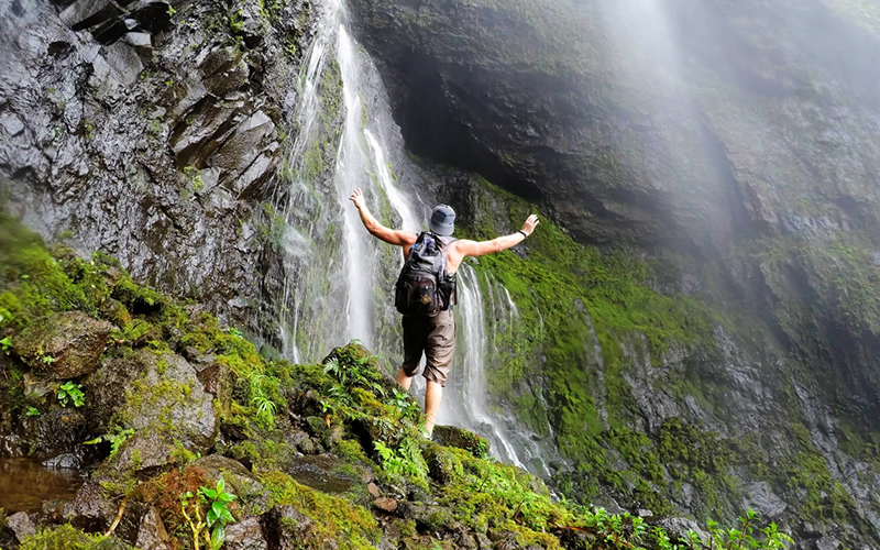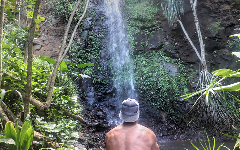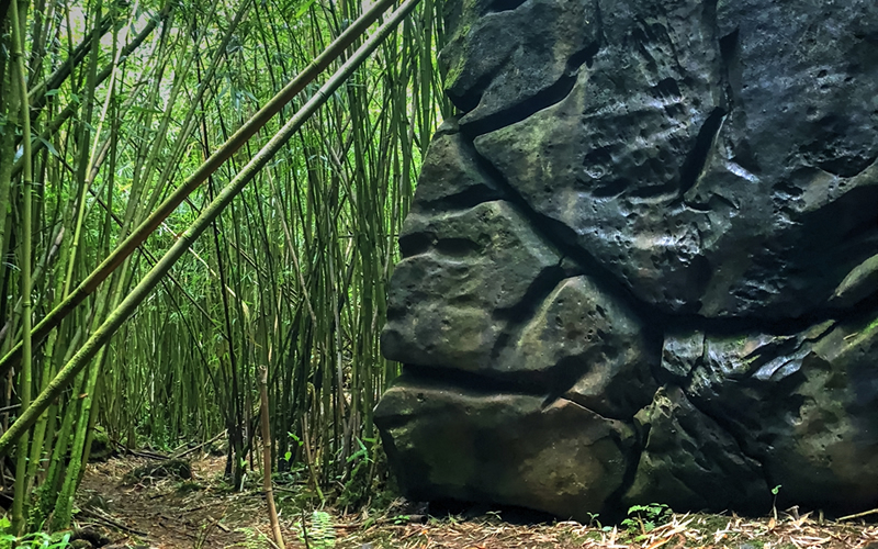 The trail meanders along the stream through lush vegetation as you head towards the falls. After the first river crossing, you will come into a bamboo forest with a giant Albizia tree. This hike is straight out if Tarzan of the Jungle. You will be walking, climbing, squeezing and grunting your way to the waterfall. This hike will also test your endurance, leg strength and sense sense of direction.