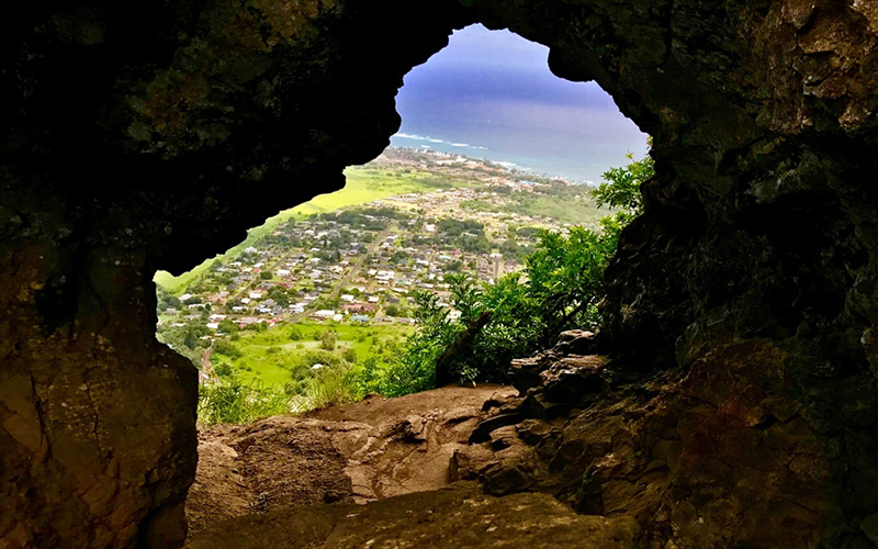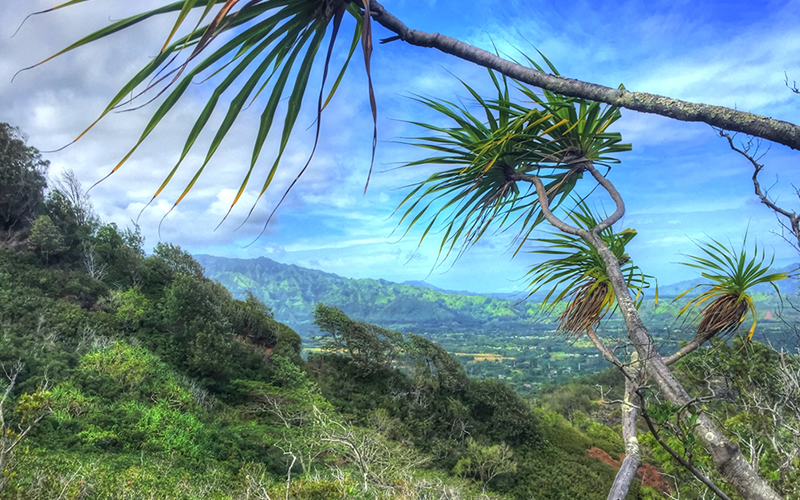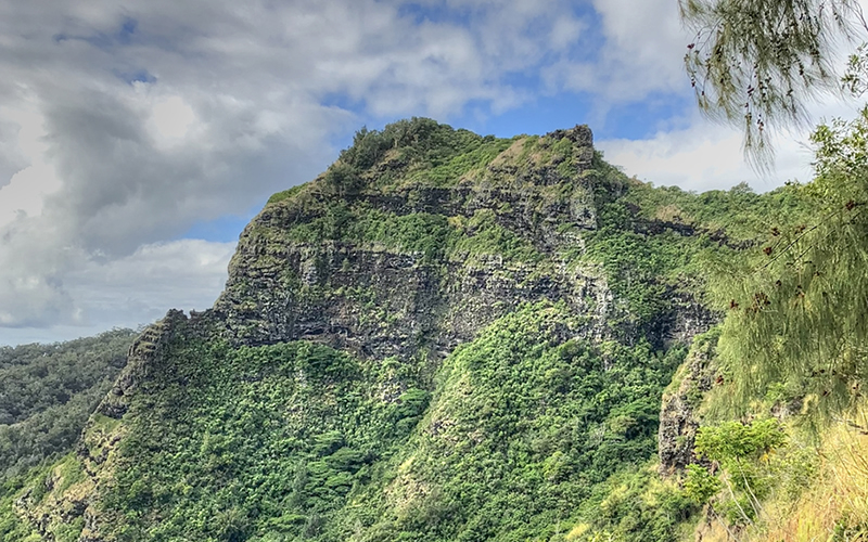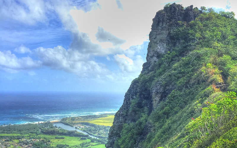 Sweeping views of Kapa'a and Waipouli from the East, and views of Kalepa Ridge, Wailua Bay and the Mt. Wai'ale'ale crater from the West. It's a quick out-and-back hike that isn't too strenuous and perfect for a quick day's adventure. The mountains behind Wailua form a natural sculpture of a giant in repose. You may have to stretch your imagination just a little to see him. The outline is clearer farther up toward Kapaa.